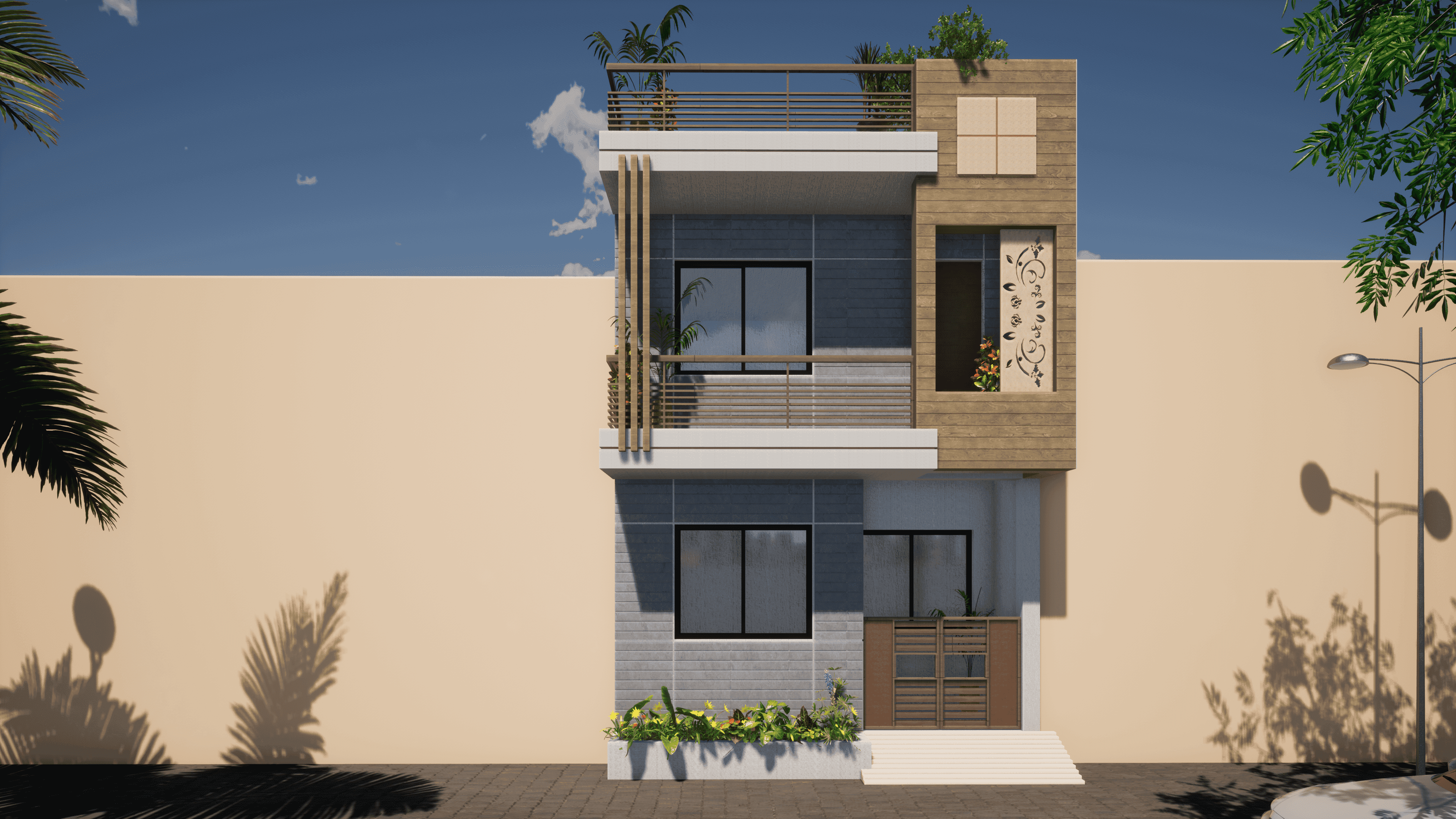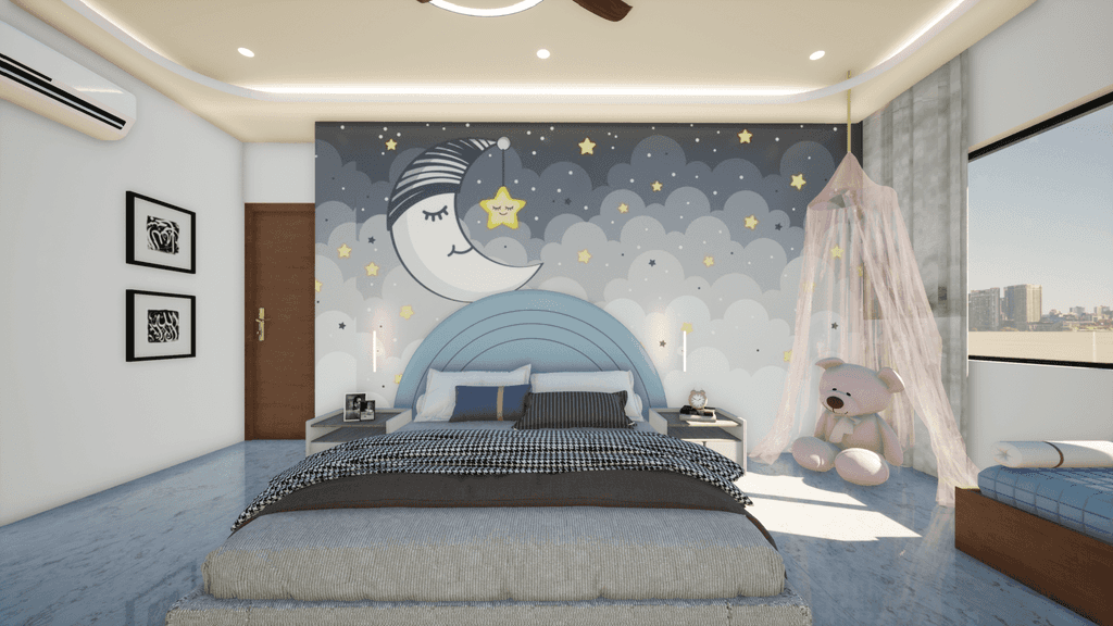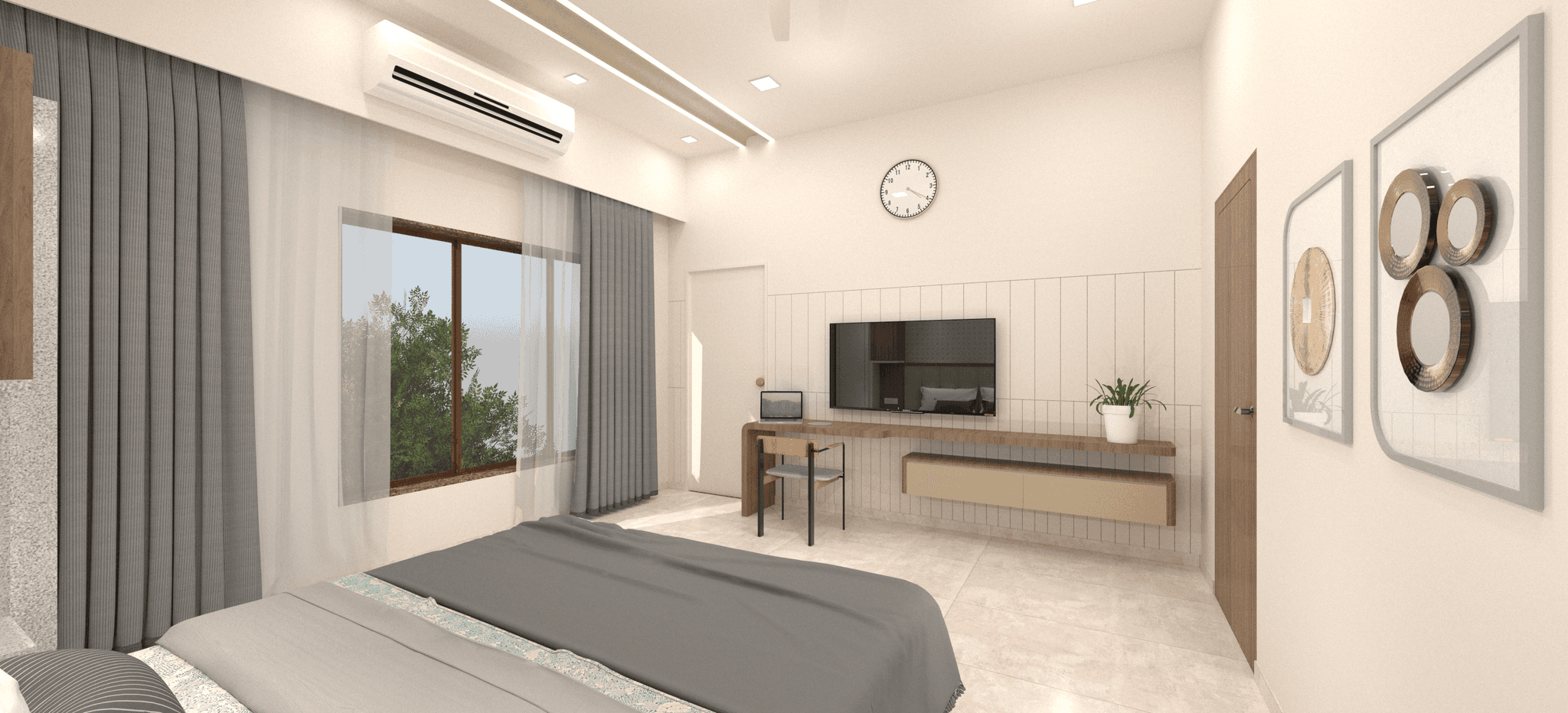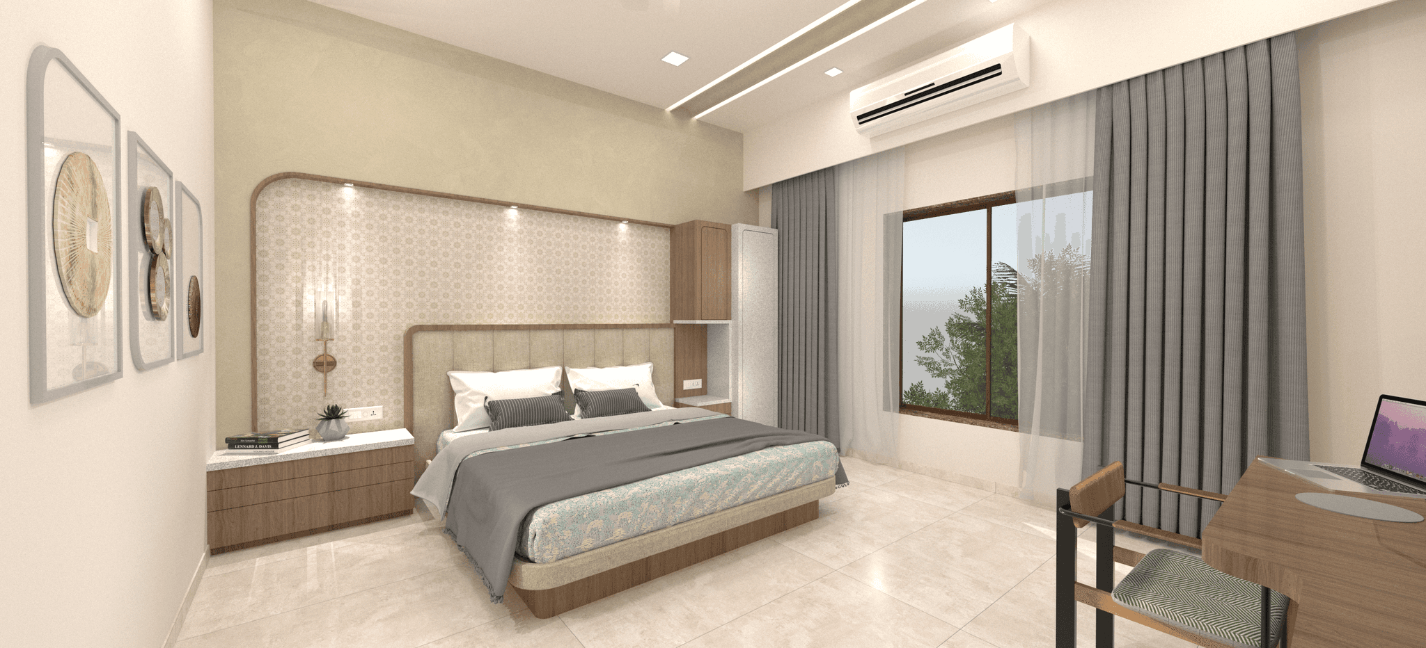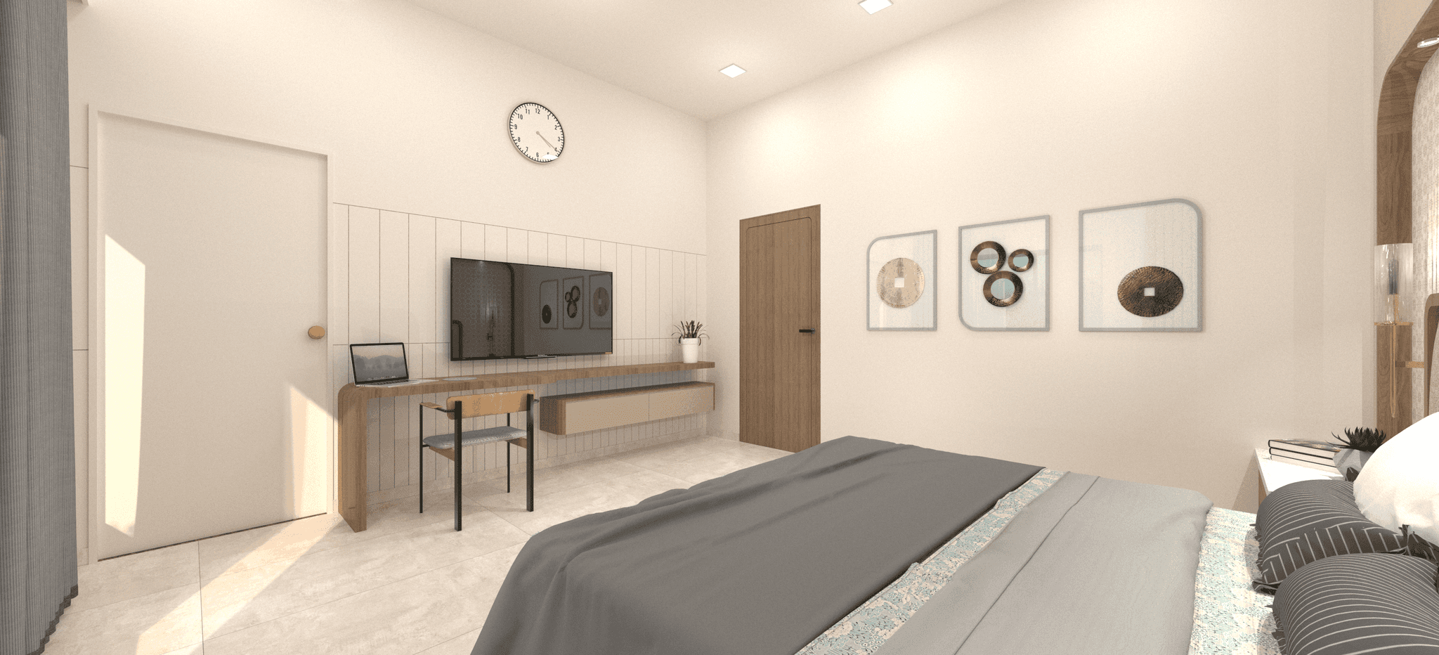 Embracing simplicity and warmth, this cozy bedroom harmoniously blends soft curves with minimal design elements, creating an ideal retreat. The ceiling maintains simplicity while an arched section running its length breaks the monotony, complementing the room's overall design scheme. Artwork tastefully enhances the room's ambiance, adding to its cohesive aesthetic.