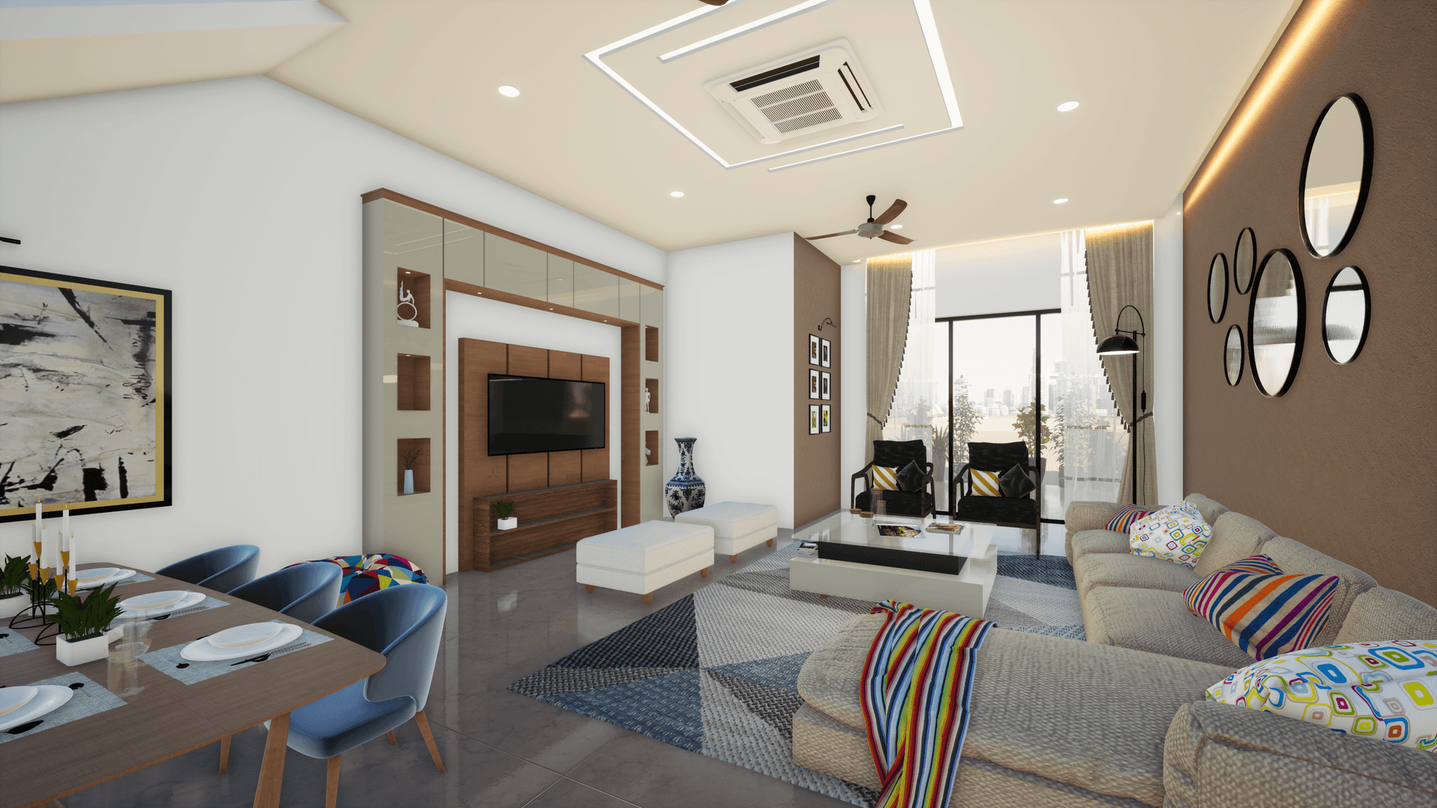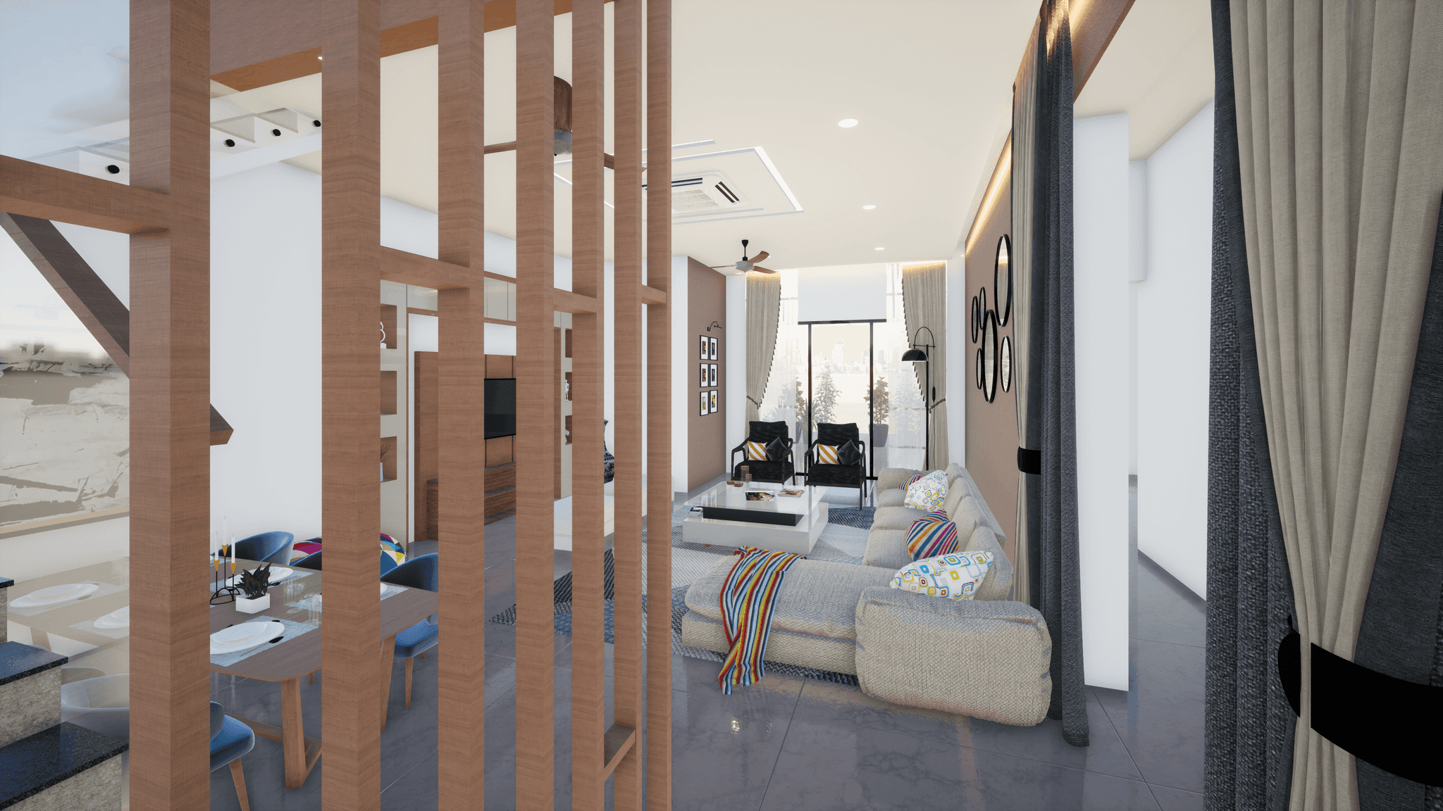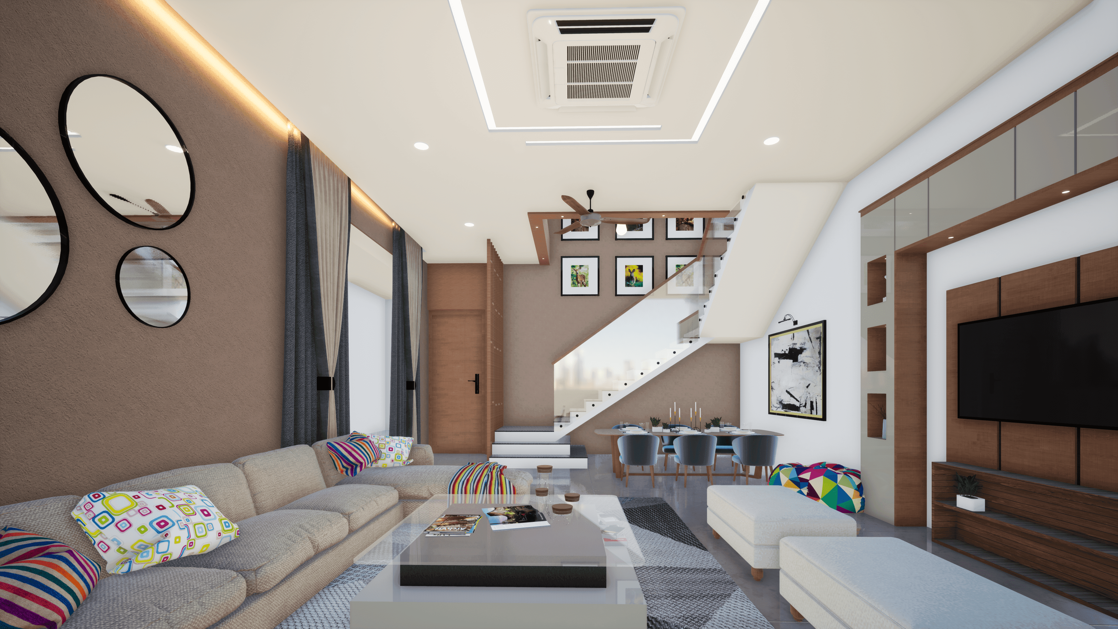 Designed for a family of a couple doctor & their children, this vibrant home features a grand living and dining area, each room uniquely crafted to meet the design preferences of the mother. Located on the third floor, the residence offers seamless city views with a small lake nearby. The main charm of the house lies in its vibrant interior, creating an inviting and joyful atmosphere for the couple to enjoy after spending long days at the hospital.