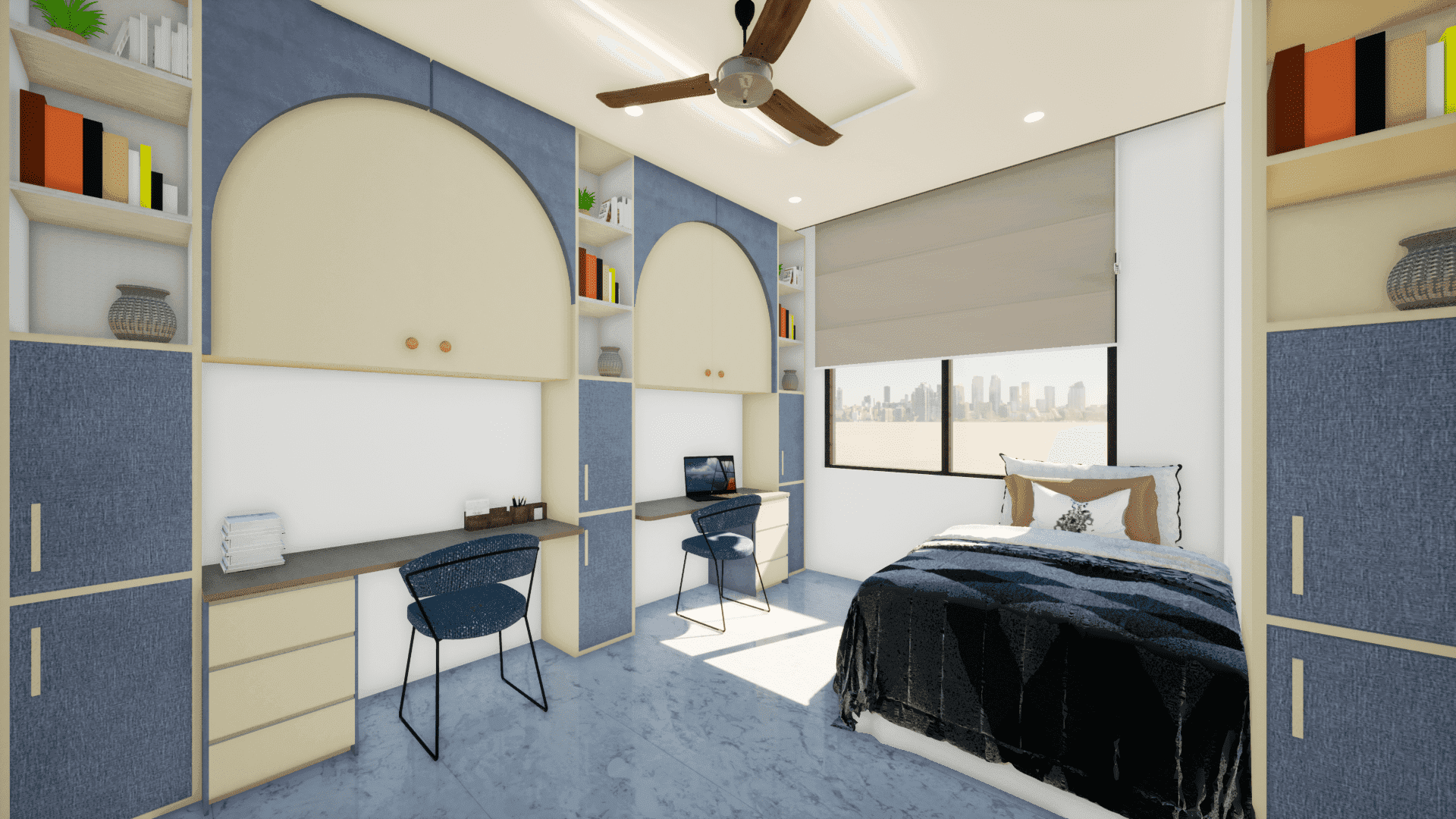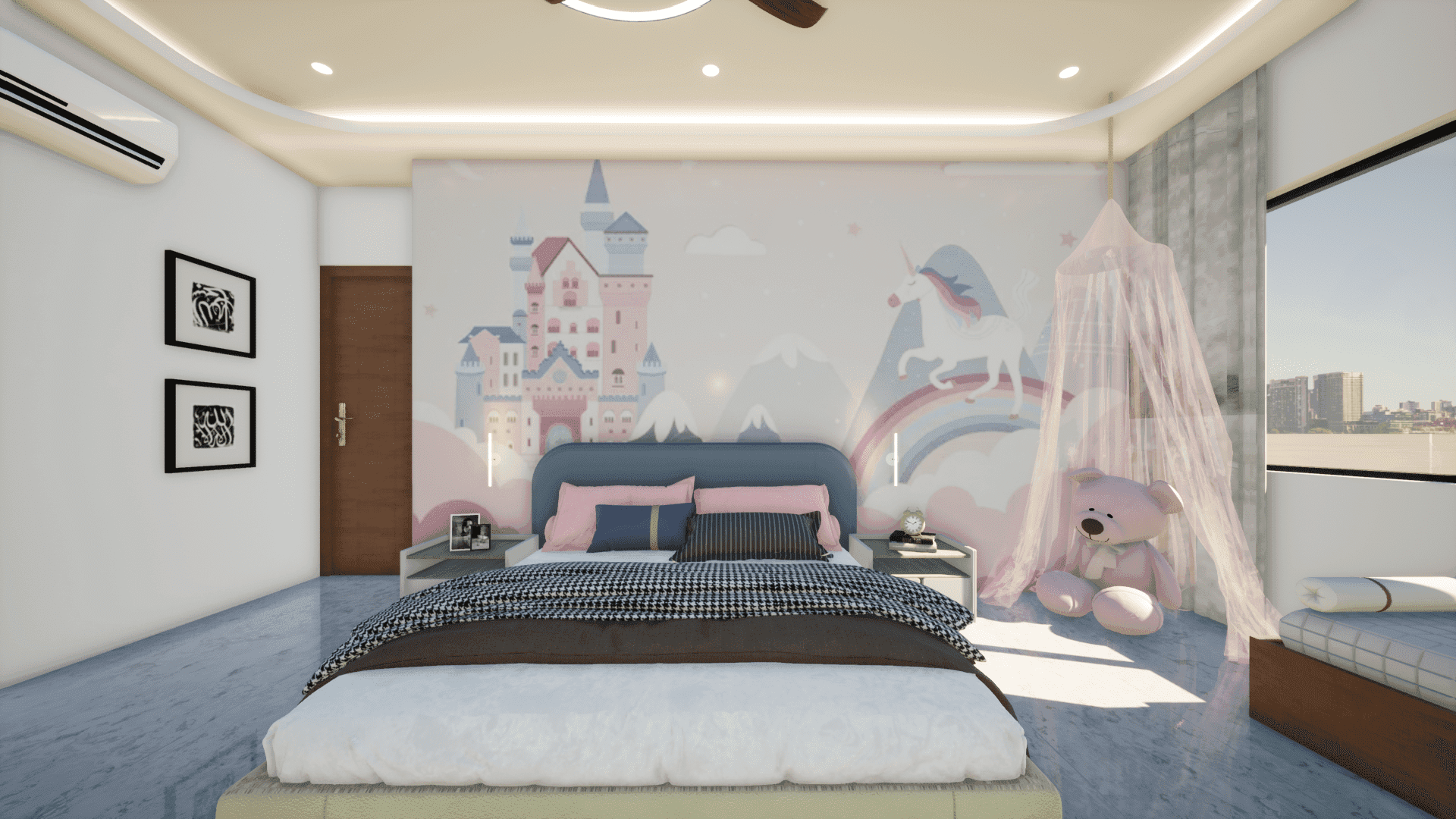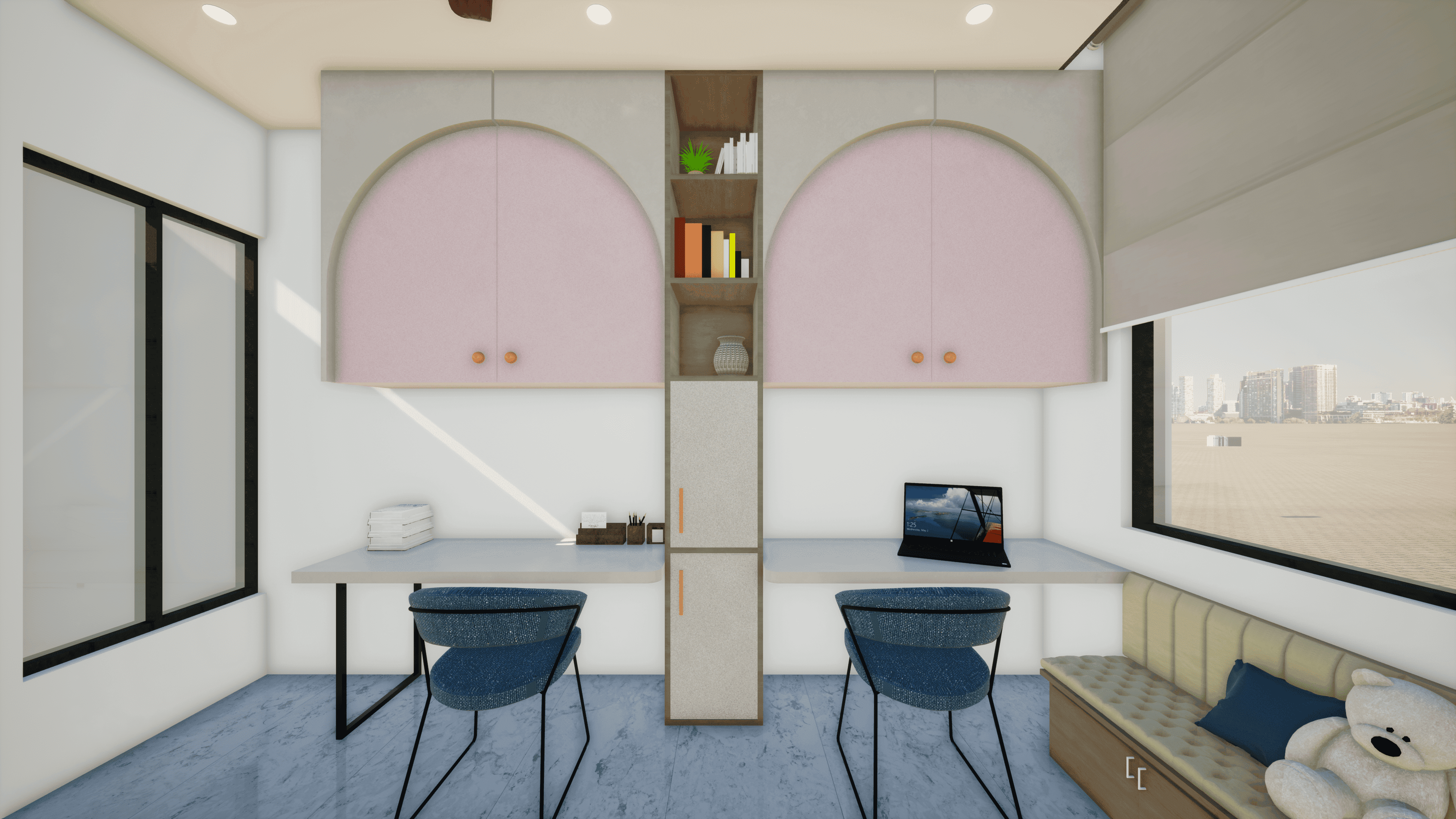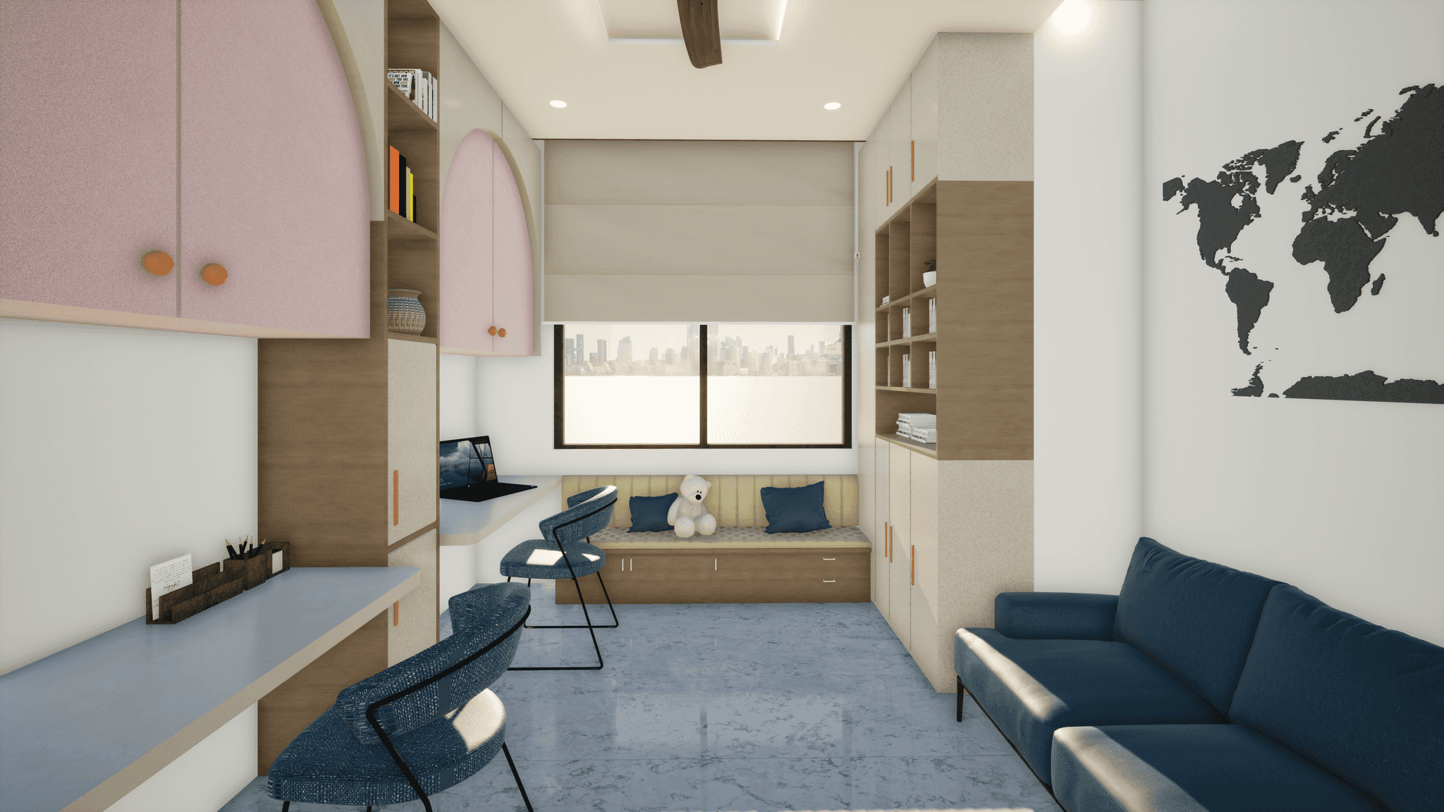 This vibrant and playful kids' bedroom and study interior design is a delightful haven for creativity and fun. The room bursts with color, featuring lively wall art. The cozy study nook is designed to inspire learning and exploration, with ample storage for books and supplies. Soft, playful lighting adds warmth. Every element is thoughtfully chosen to create a joyful and stimulating environment, perfect for nurturing young minds and imaginations. Here are various Iterations we created for Bedroom & Study Room as per Client's Requirements