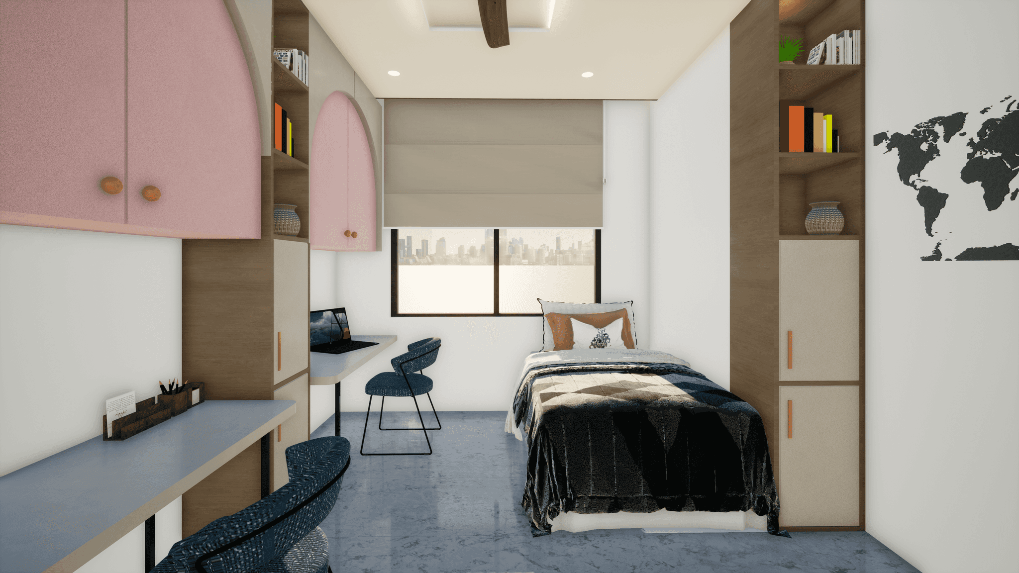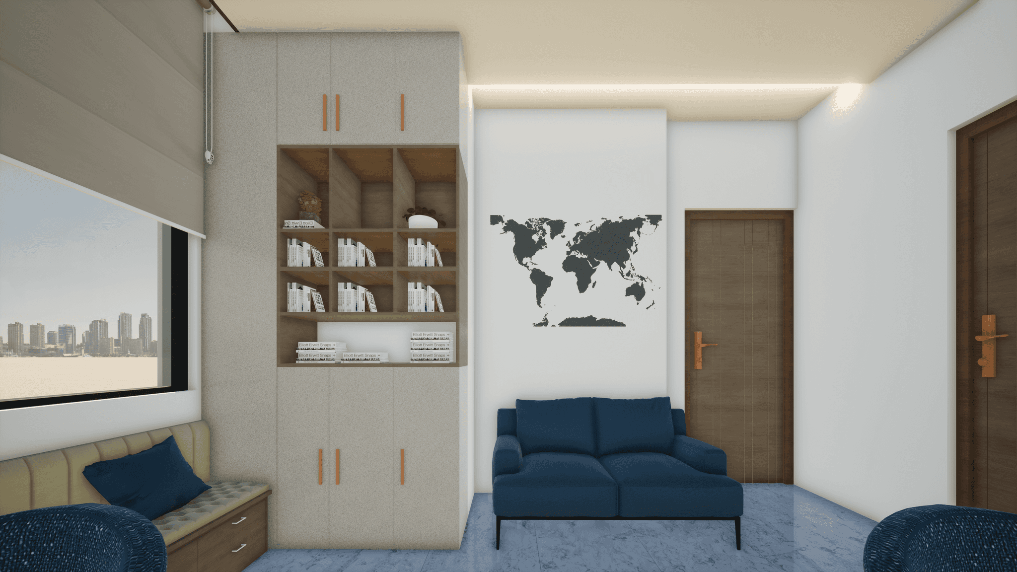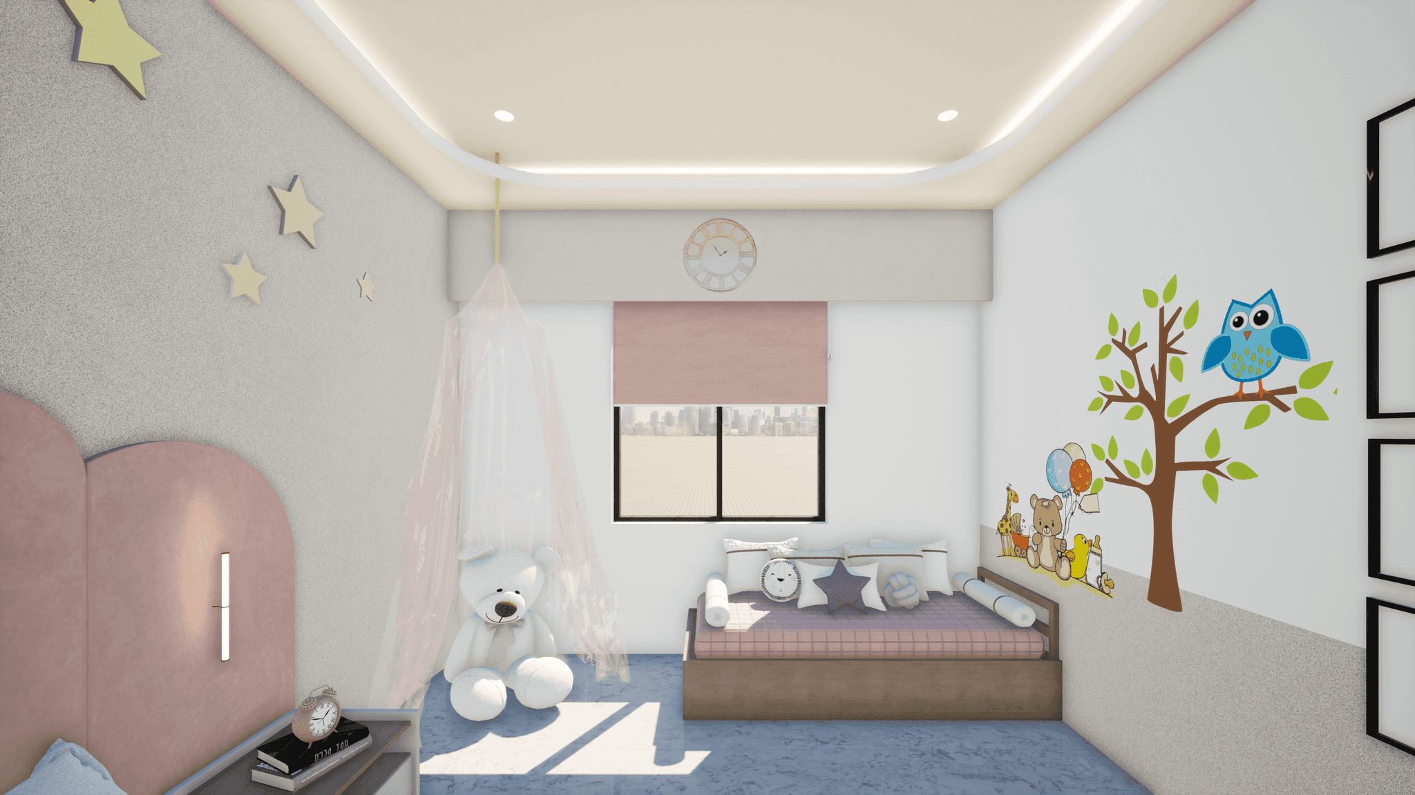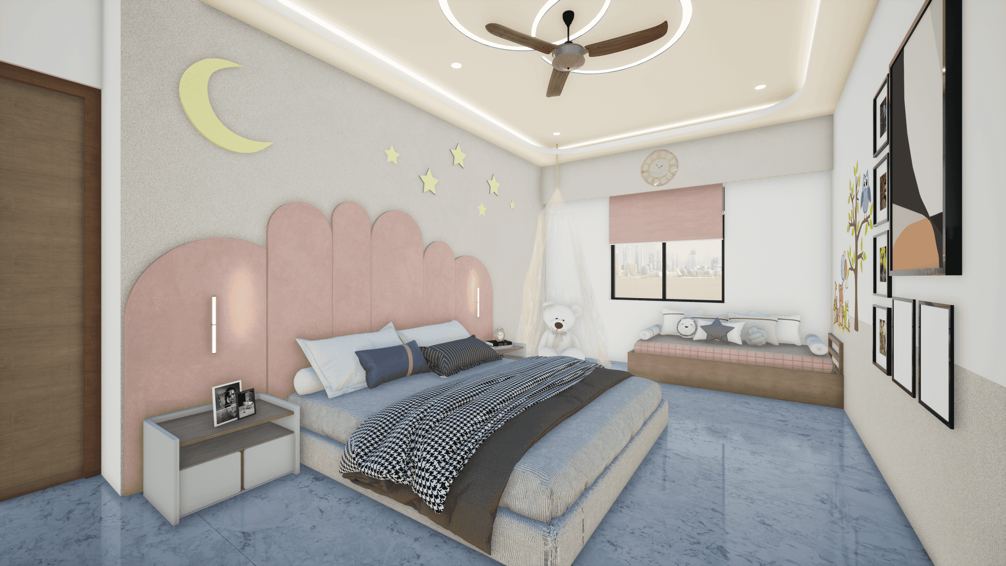 This vibrant and playful kids' bedroom and study interior design is a delightful haven for creativity and fun. The room bursts with color, featuring lively wall art. The cozy study nook is designed to inspire learning and exploration, with ample storage for books and supplies. Soft, playful lighting adds warmth. Every element is thoughtfully chosen to create a joyful and stimulating environment, perfect for nurturing young minds and imaginations. Here are various Iterations we created for Bedroom & Study Room as per Client's Requirements